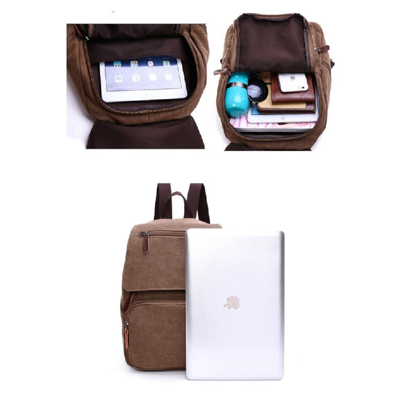 Mochila de lona mediana, muy práctica y bonita. Detalles de ecocuero. Varios compartimentos y bolsillos para llevar tus cosas de forma organizada y segura. Ideal para llevar una tablet, pero también cabe justo tu notebook de 14".