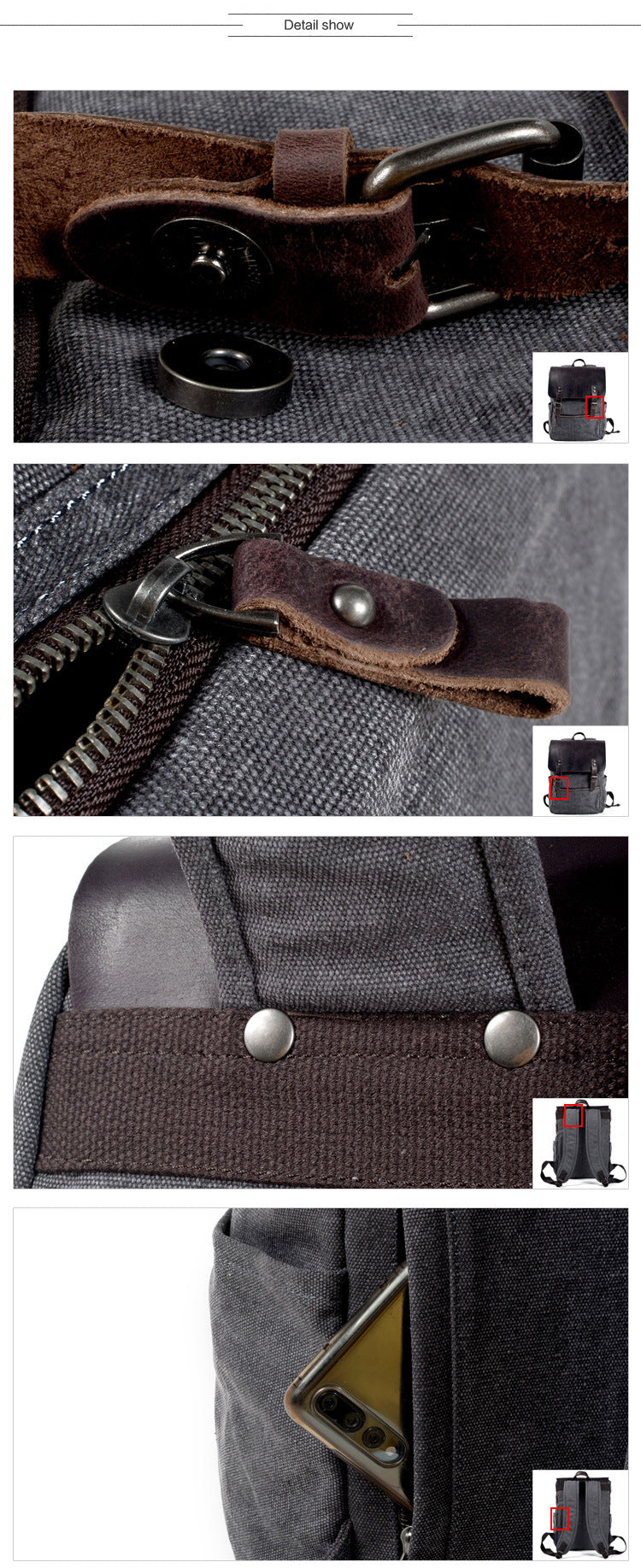 Lona encerada impermeable + cuero natural.