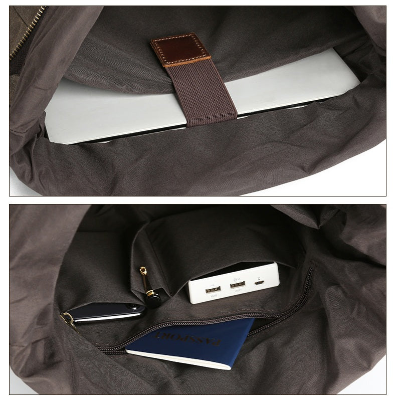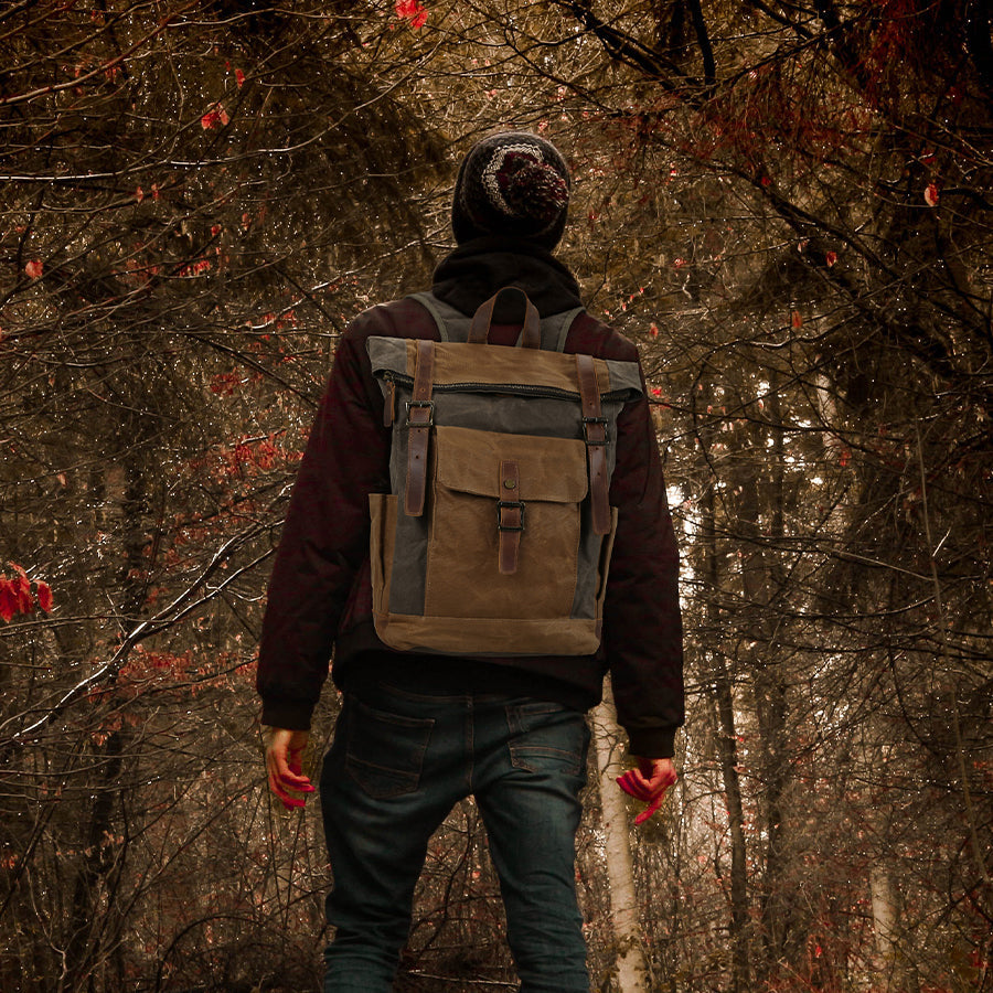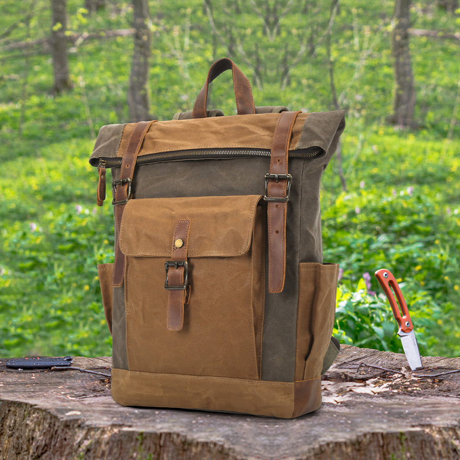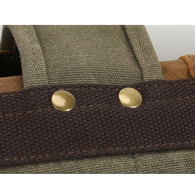 - Lona encerada resistente a humedad y lluvia ligera, con refuerzos en cuero natural para mayor durabilidad.